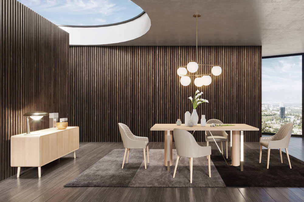 Bàn ăn gỗ sồi Oak với thiết kế thanh lịch mang đến một không gian phòng ăn sang trọng. Chân trụ tròn đỡ mặt bàn bằng gỗ sồi ghép kết hợp thép mạ màu gold tạo thành một khối hài hòa vững chắc. Mặt bàn bằng gỗ veneer sồi vẫn giữ màu sáng, vân gỗ được chọn lọc kỹ đều và tinh tế.