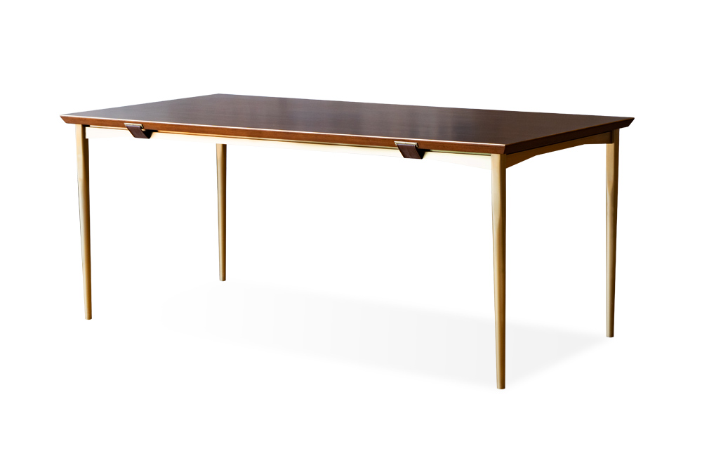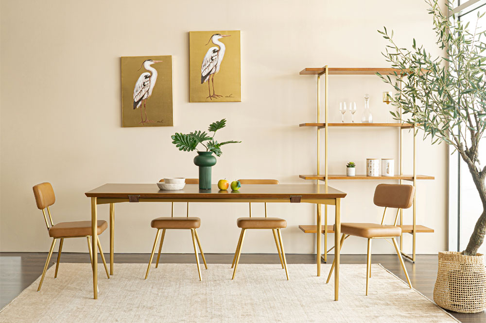 Bàn ăn Maxine là một thiết kế tối giản với bốn chân inox màu gold thuôn dài mang kiểu dáng thanh thoát. Mặt bàn gỗ MDF Veneer recon walnut cùng những đường vân uốn lượn tự nhiên tạo vẻ ngoài bắt mắt. Sự kết hợp hài hòa giữa màu nâu trầm với màu ánh kim tạo nên nét sang trọng và thanh lịch cho không gian phòng ăn hiện đại.